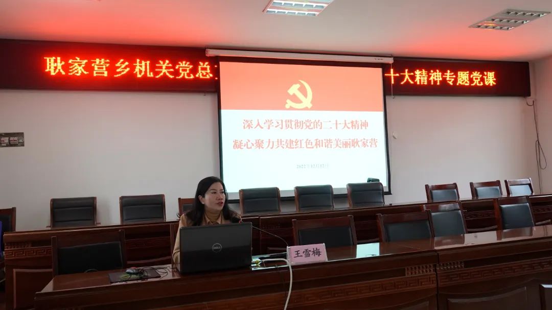 王雪梅以《深入学习贯彻党的二十大精神 凝心聚力共建红色和谐美丽耿家营》为主题,从充分认识学习党的二十大精神的重大意义、全面深刻学习领会党的二十大精神、坚持知行合一贯彻落实党的二十大精神三个维度出发,围绕大会主题、过去五年工作和新时代十年伟大变革的重大意义、开辟马克思主义中国化时代化新境界、以中国式现代化推进中华民族伟大复兴的使命任务、全面建设社会主义现代化强国的十二条基本方略等五个方面对党的二十大提出的重要思想、重大战略、重大举措进行了深入阐释和系统宣讲。